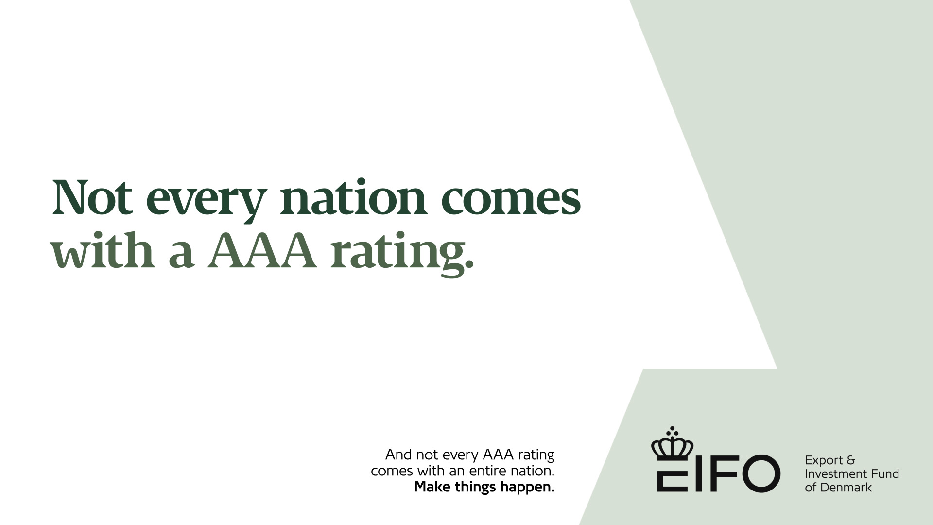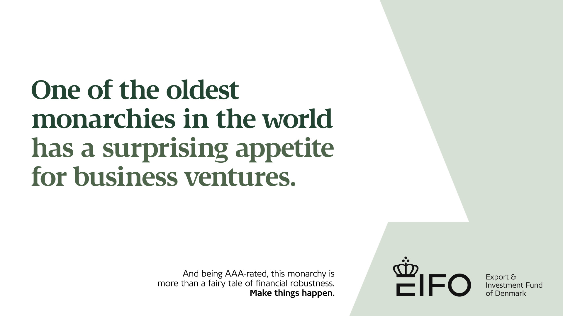 As financial backers come, there is a certain robustness to an entire nation having your back. Not just because of Denmark’s AAA rating, but also because Denmark believes in the dynamics of business for the common good. Make things happen.